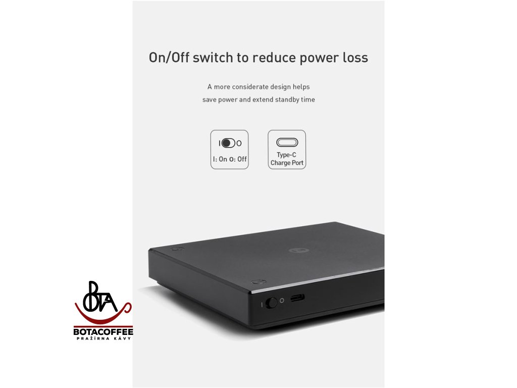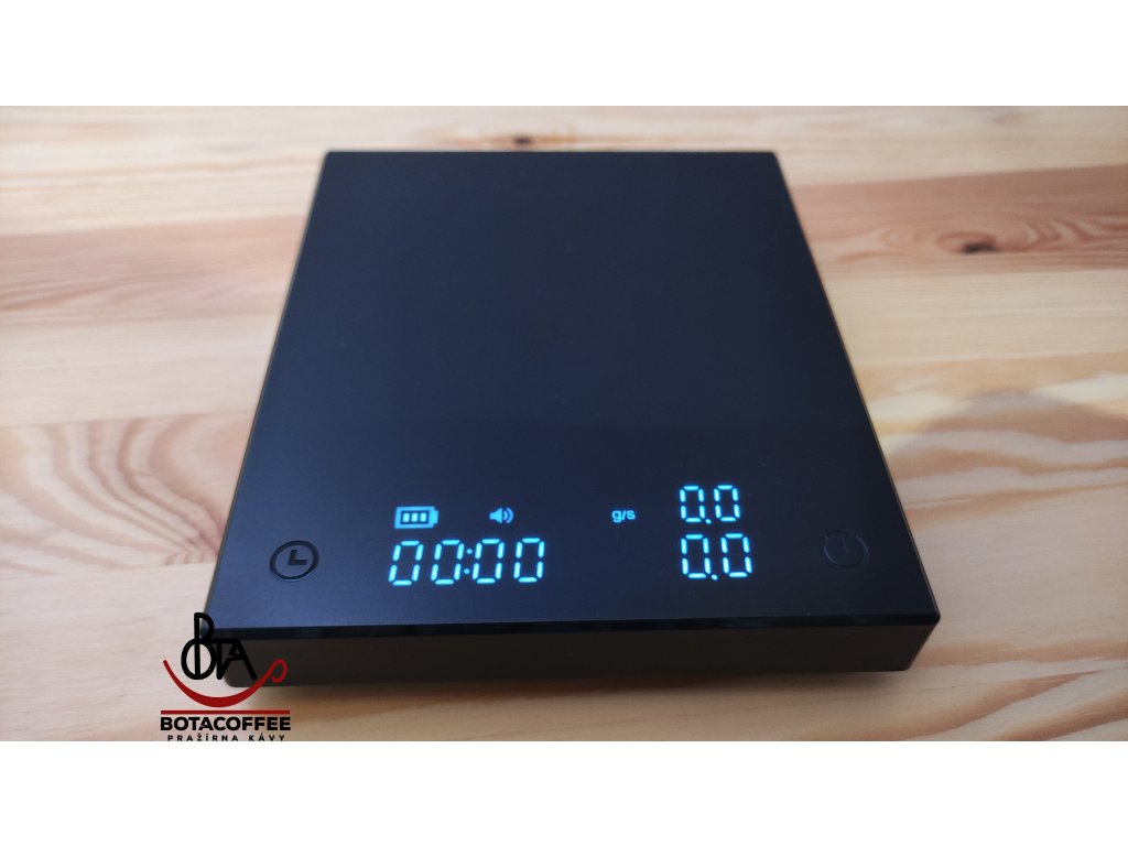 Váha disponuje nejen funkcí vážení (jak kávy, tak i vody), časovačem, ale oproti svému předchůdci i zobrazením rychlosti nalévání (průtok - g/s).