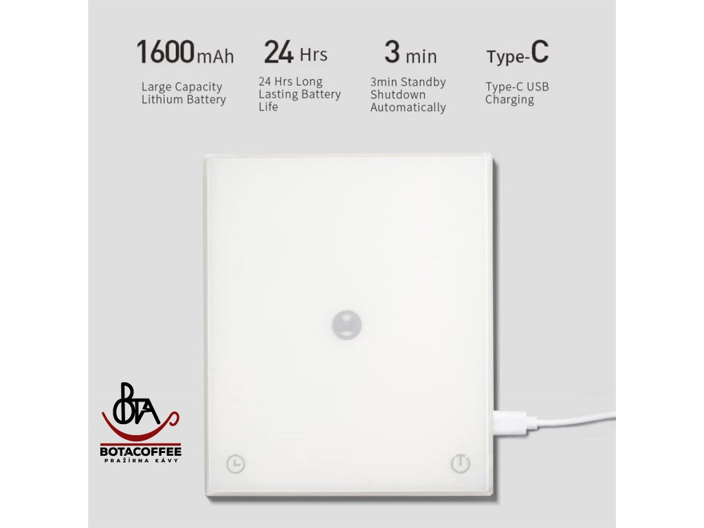 Rozměry 150 mm x 130 mm x 26 mm dělají z váhy Timemore White Mirror Basic+ ideální váhu pro filtrované kávy. Perfektně na ni sedí Chemex, nádoba s dripperem nebo dva hrníčky na espresso současně. Hlavně na Chemex ji oceníte, protože ten se vejde opravdu na málokterou váhu.